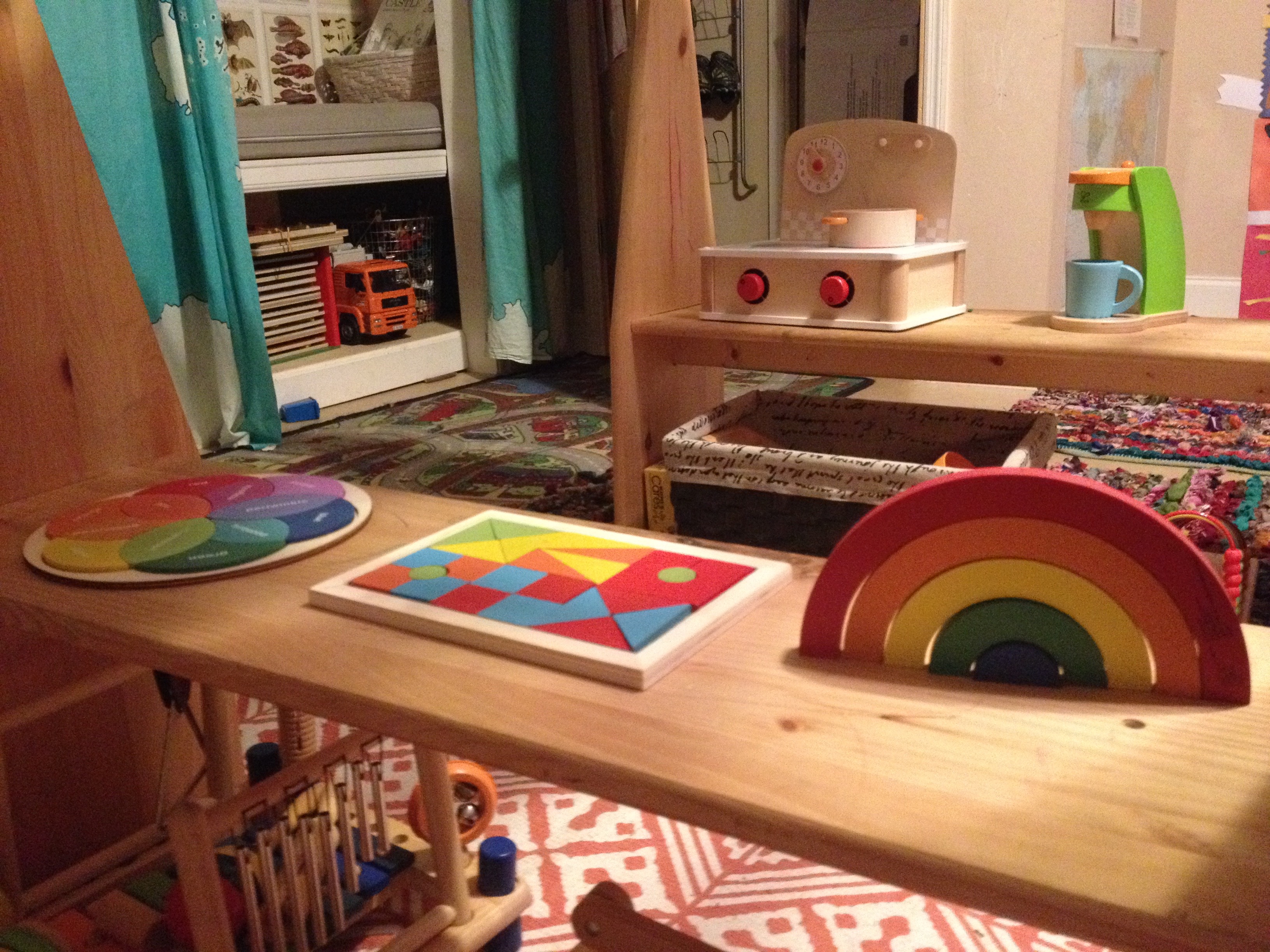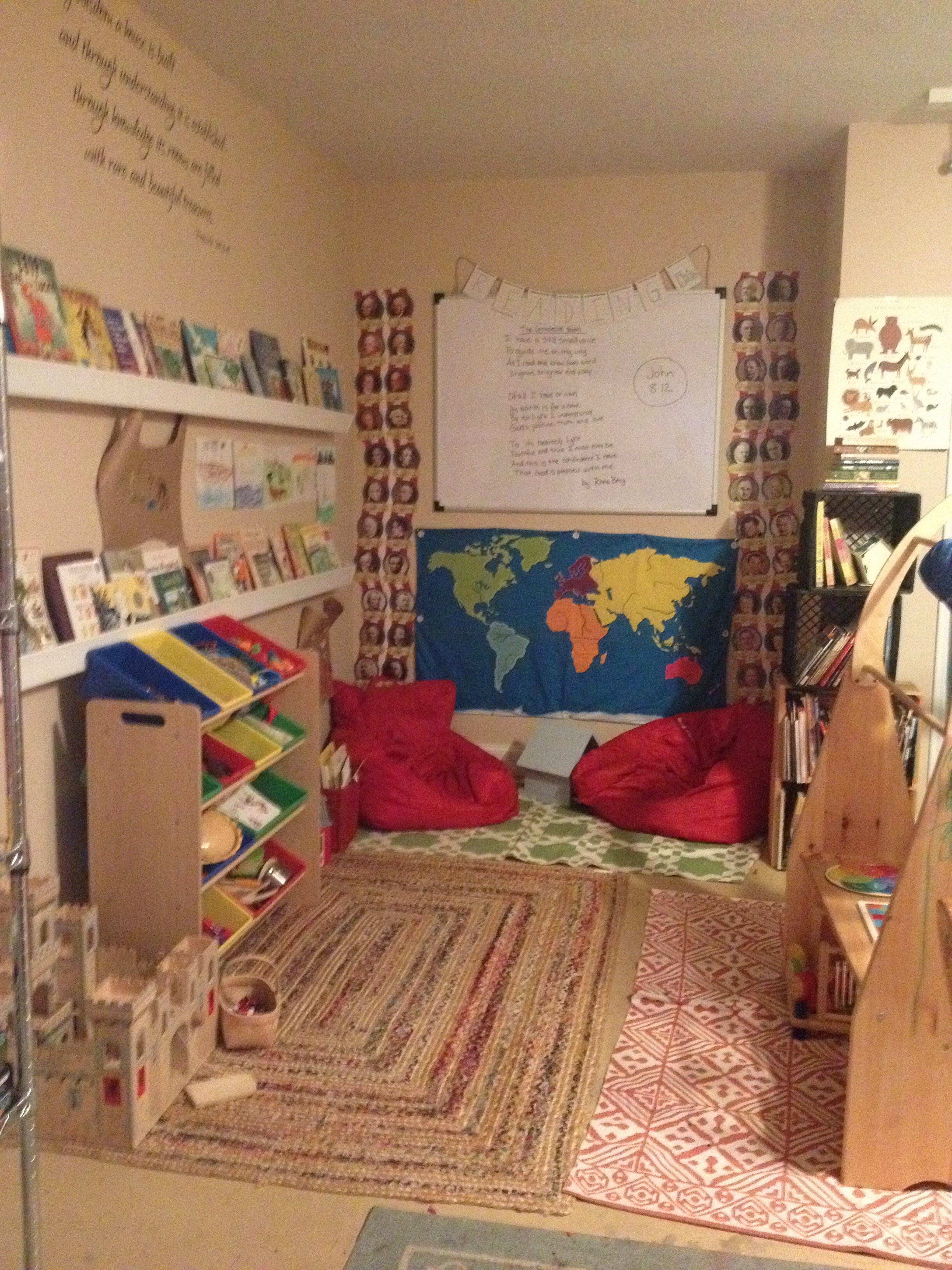 Our reading corner has a new location away from the play stand, or as it was known the first four weeks of Adventures, “The Launching Pad.” After repeated collisions and head trauma, I figured it was time to rearrange things.