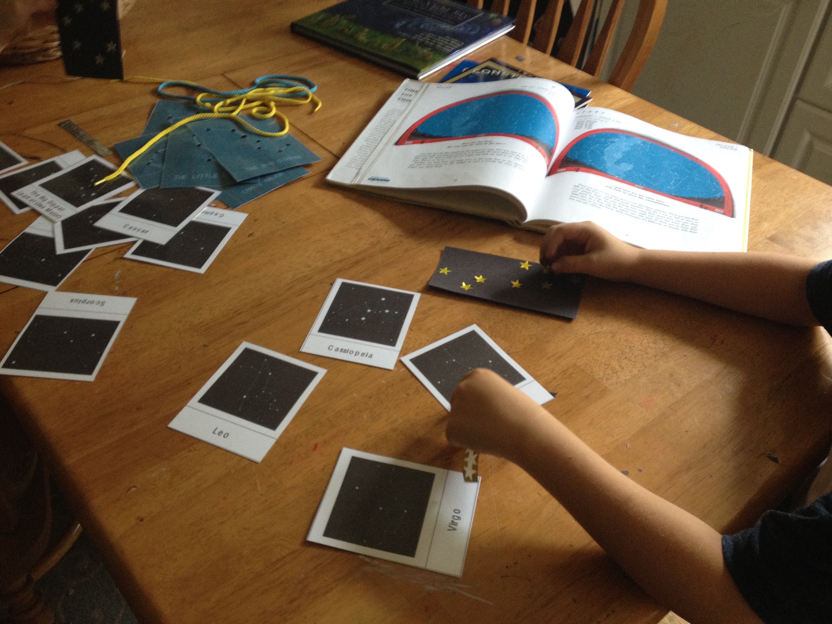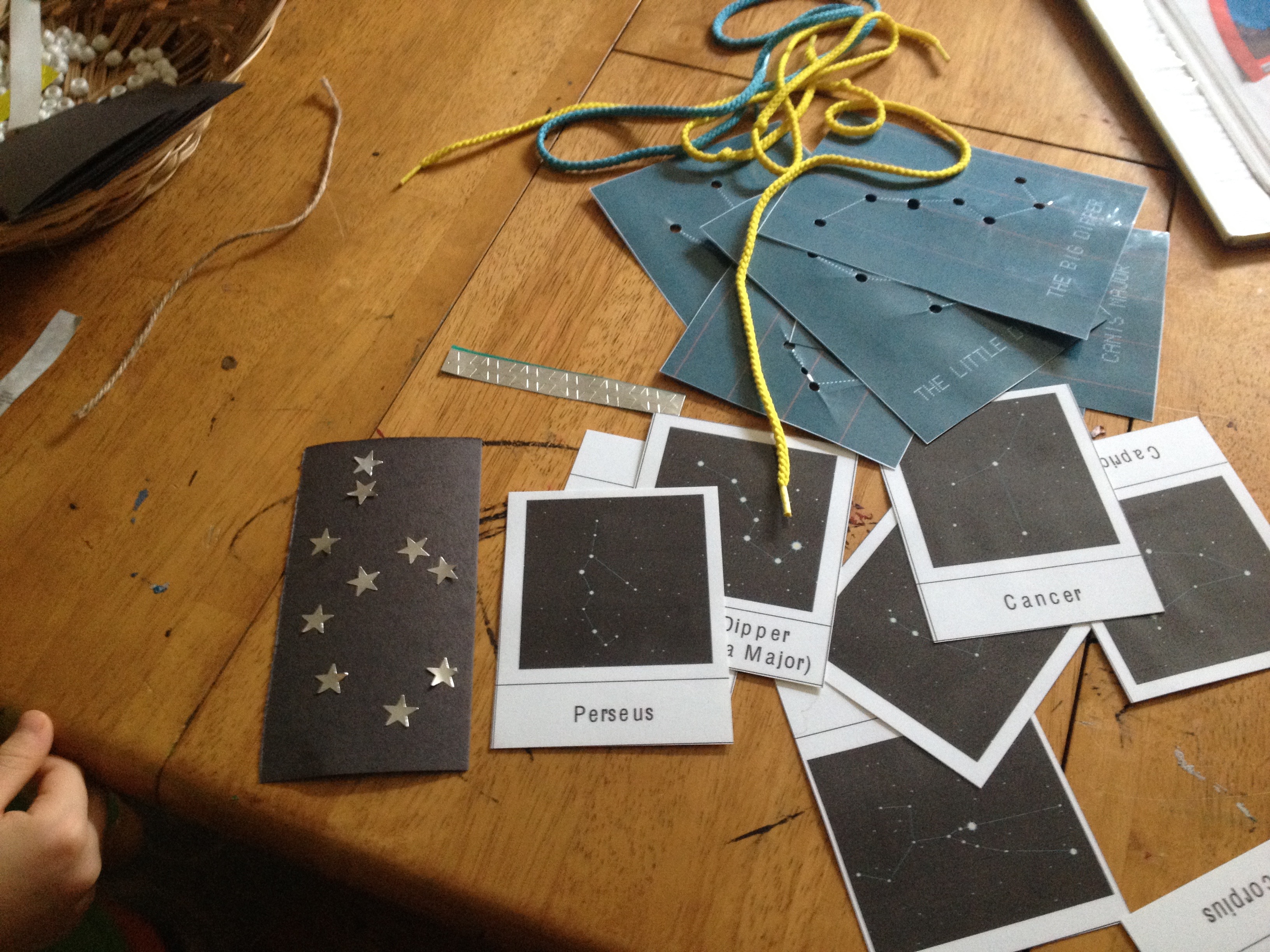 I printed out Montessori cards, lacing cards and set out black squares of construction paper along with little star stickers so they could build various constellations.