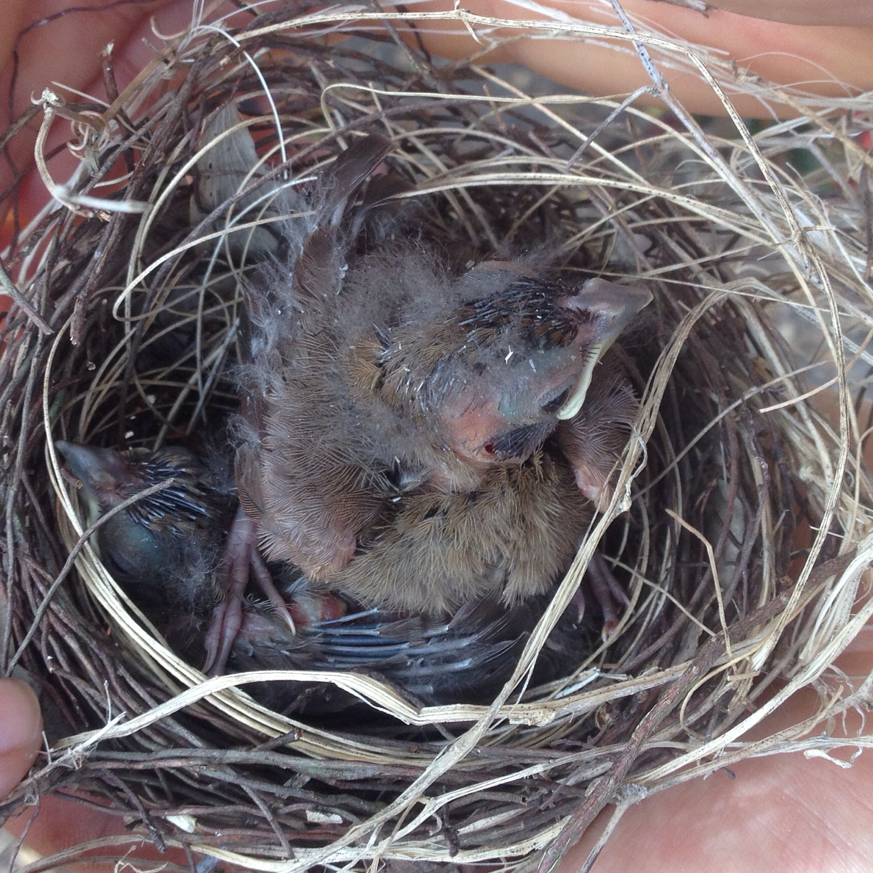 Because we slowed down we heard the tiny chirps of baby cardinals tucked high in the limbs of our jasmine tree. We were there the day the nest tumbled down after a particularly bad storm. We scooped up the nest and quickly tucked it back in place.