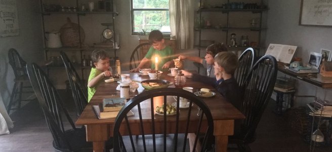 My third born still occupies his own desk in the corner of our classroom. My eldest boys meet at the table or at our new Science/Art bar. My youngest has his own desk and chair, which are height appropriate for his age. I have a Waldorf Playstand set up behind him, filled with manipulatives and Montessori style “work” that he can do during the day. A small adjoining open bookcase houses his current sensory bin work. The boys can all work at their stations at the same time, but there is also room at the main table for everyone. In laying a feast of ideas a lá Charlotte Mason, I don’t want to simply distract my preschooler so that he is left on the floor begging for crumbs. If he wants to join us he can. He can come be with us at the table or he can go back to his own space where he has full reign over his resources. Lesli and Kathy have written about environment extensively in their initial Homegrown Preschooler book. Check it out!