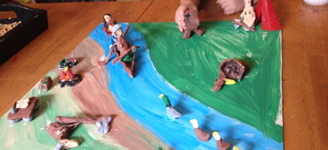 We stretched the first lesson out over a period of three days. We spent the first day reading through the entire Genesis account of creation, narrating and discussing it. Day two was spent reading about evolution and going through Streams of Civilizations. The third day was spent further discussing terms found in the Streams of Civilization book. Everything from uniformitarianism to sequence dating. I am a bit surprised that the kids were so excited about their glossaries! We read additional living books each day and on the third day we also read several living books about archeology and anthropology and even went on a “dig” in the backyard to uncover some chicken bones I had buried the day before. Have you checked out the newly released film “Is Genesis History?” The boys and I saw it in the theater a few weeks before our study began and it was such a helpful starting point for our discussions about Creation, Evolution and the Flood. We spent the remainder of our time on the third day researching the bronze age before the lesson migrated to the backyard with the boys all fashioning spears and weapons out of rocks. I probably should have seen that coming.