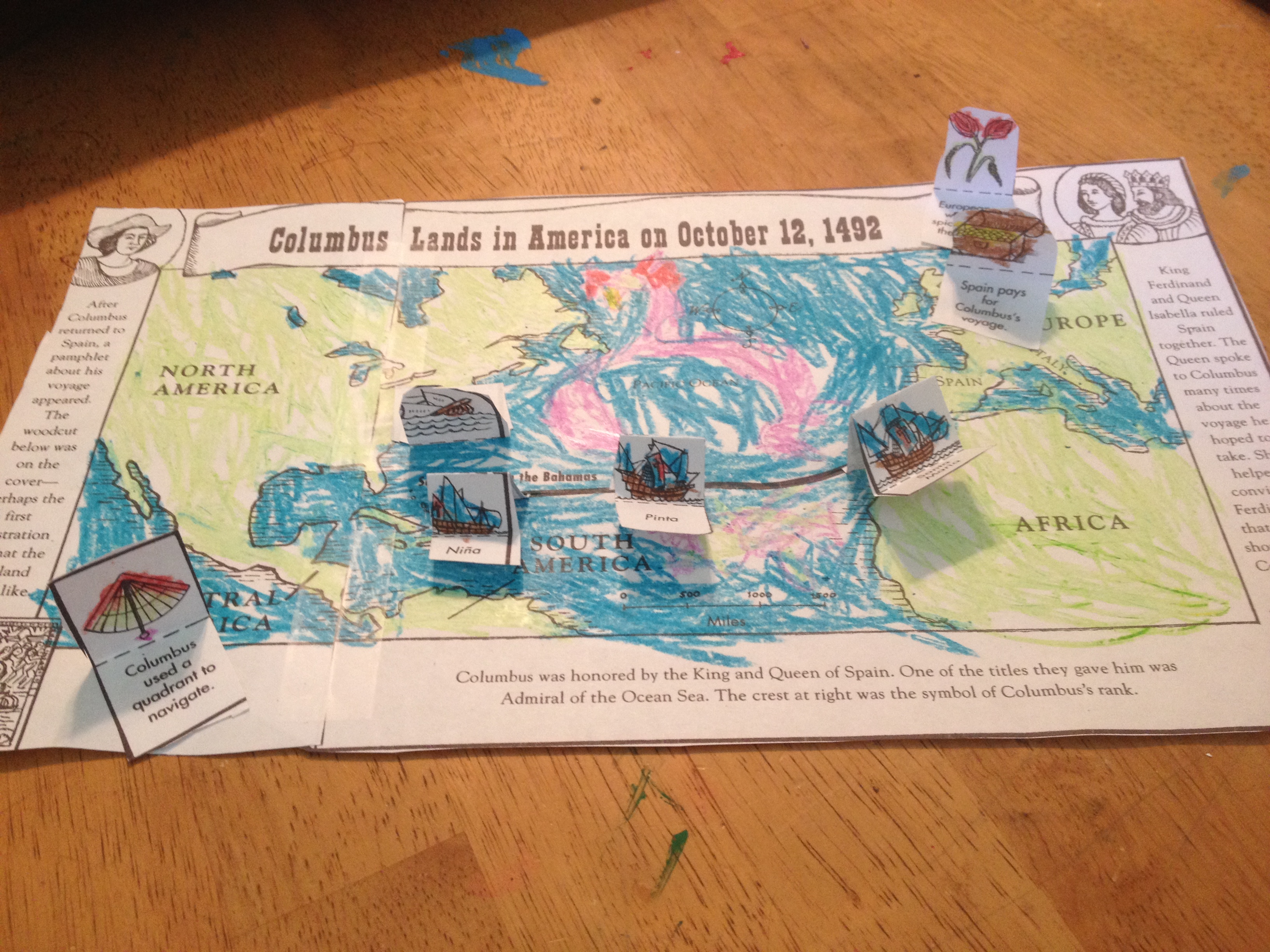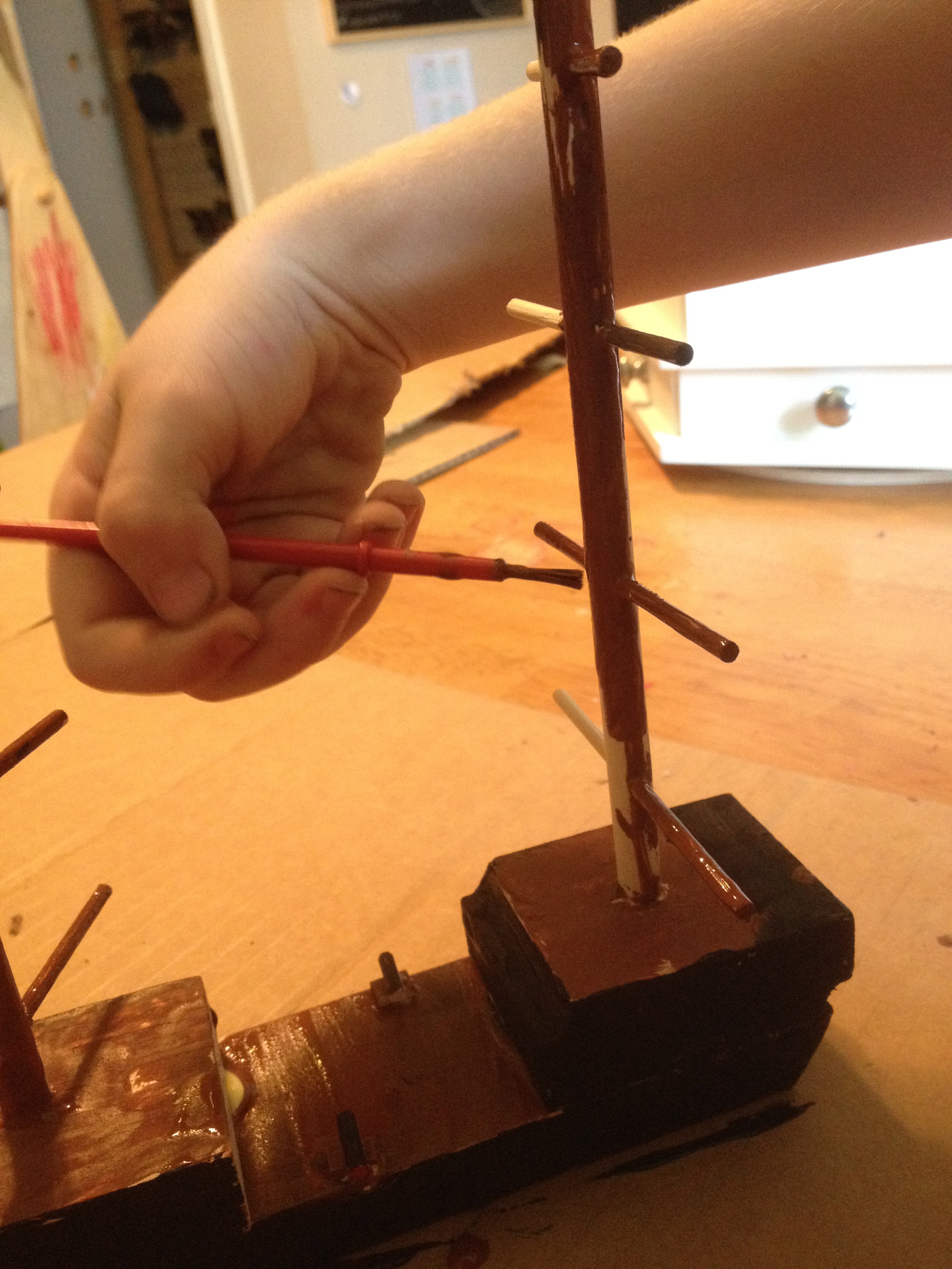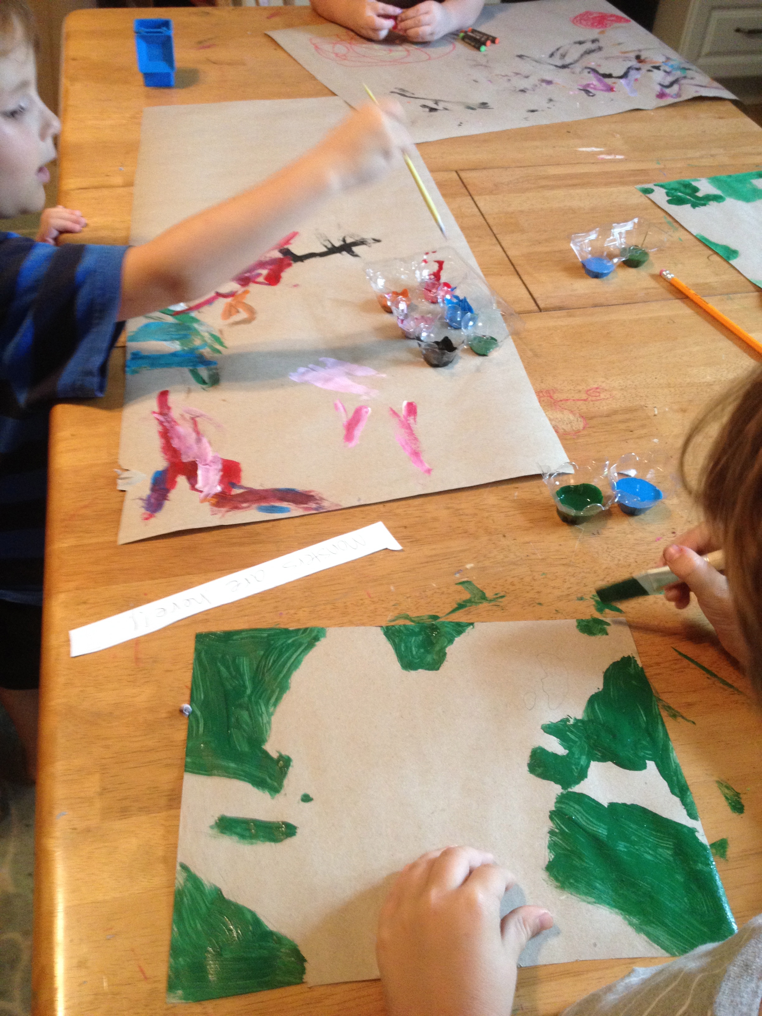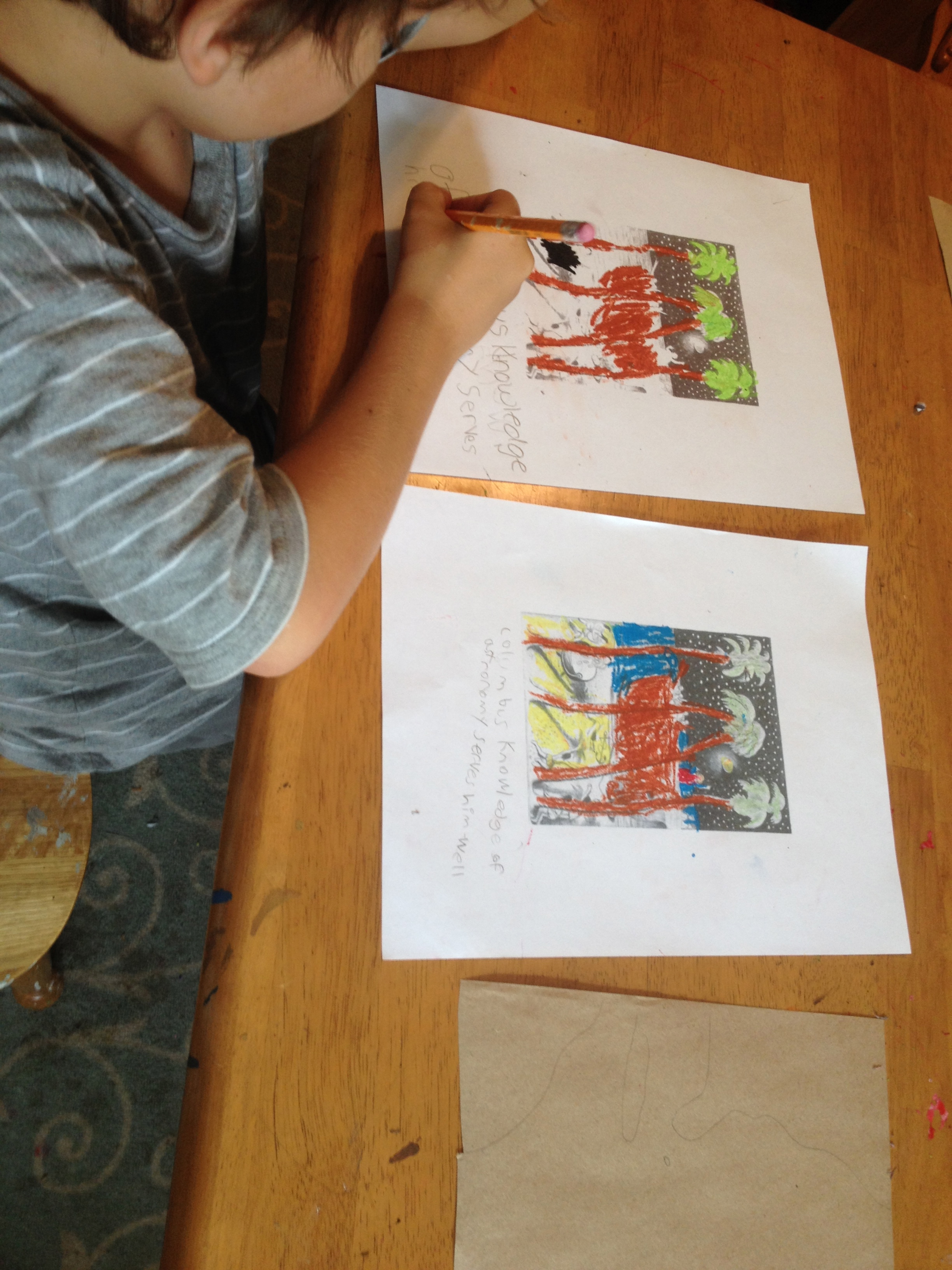 Lets think about these cave paintings. Where did all the different colors come from? What materials can we gather if we were to make this painting? Could we make this painting in another form? How would it look as a sculpture? watercolor? mixed media? The more artists and artwork we add to our vocabulary the more depth this step begins to have. For example, my seven year old choosing to paint triptychs based off of woodcuts from one of his favorite storybooks using brushes he made out of sticks and ferns from the back hollow. This idea sprang from a dozen sources and converged upon our dining room table one random rainy afternoon.