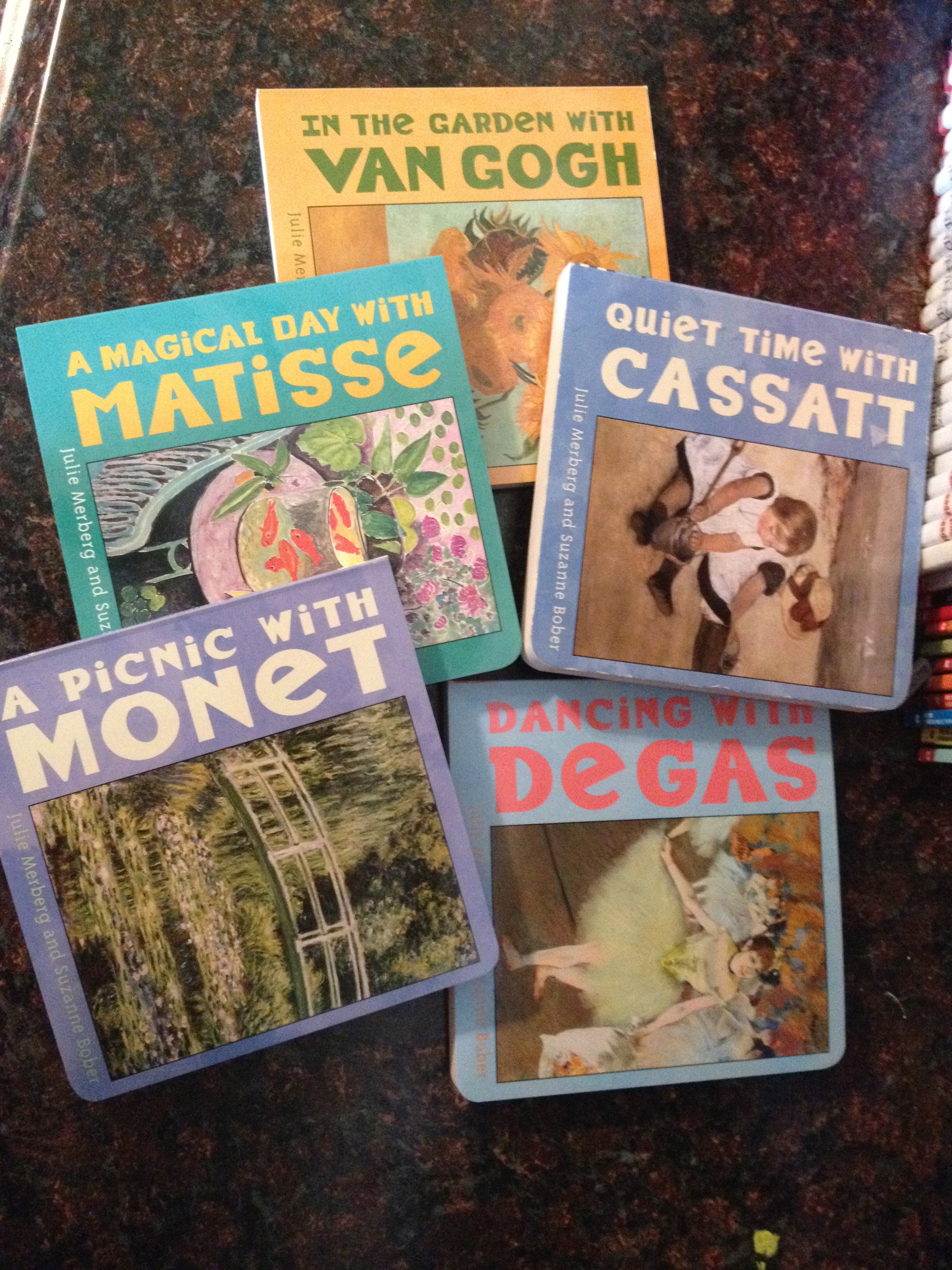 To the right of our book cart we have set up several small book cases with tons of books for them to handle as the need arises. Their school books are also tucked in these cases. On top of the bookcases are all the writing and art tools they use on a daily basis. We notebook nearly everything and I will be posting how we do this as the year progresses. I purchased all of their notebooks ready made here along with paint jars, watercolors, brushes and modeling clay. (Yes, long time readers that spy the rainbow boxes in the corner, I caved and got a chicken war cart of doom!)