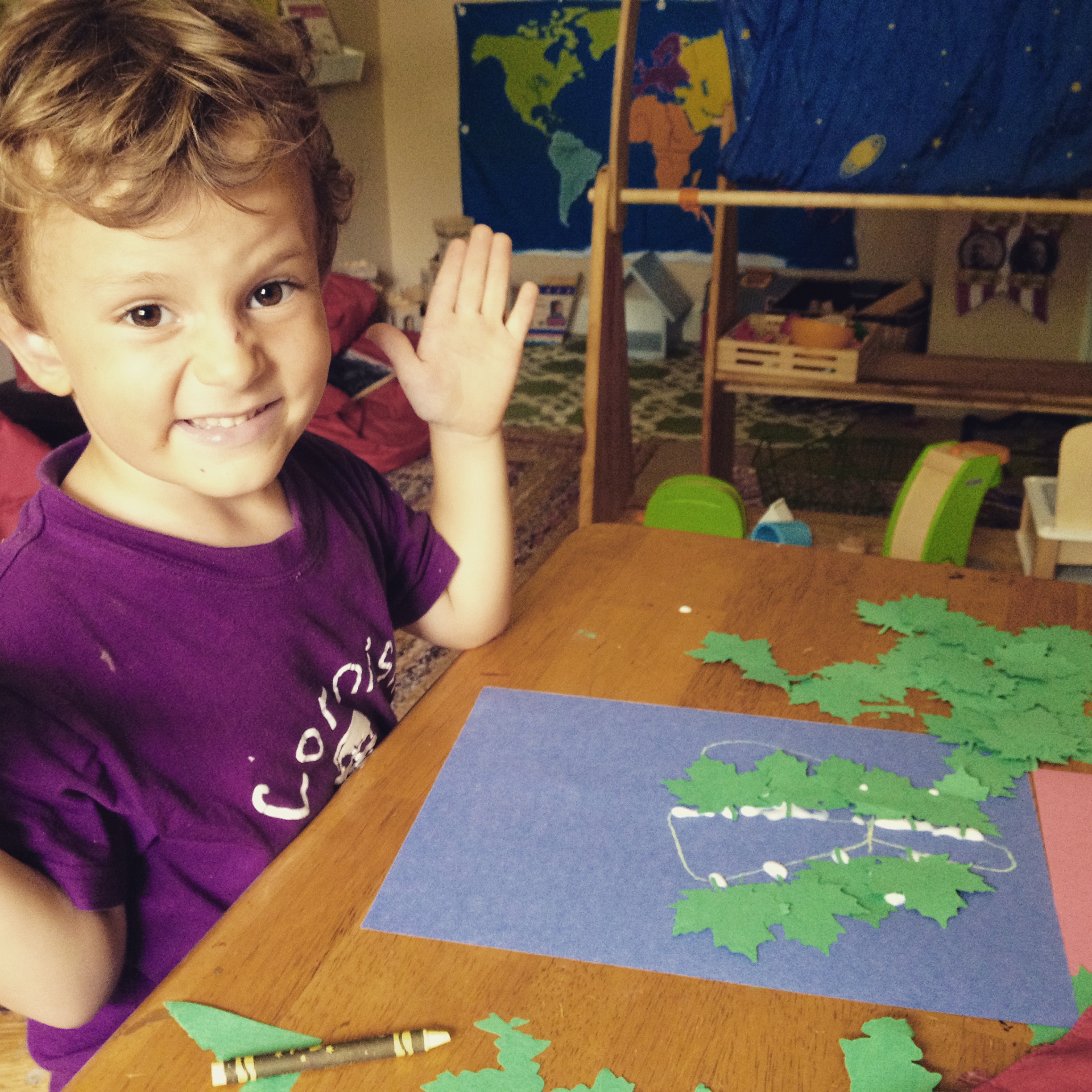 I have set up several small spaces throughout the room that I can change throughout the year for the younger two to play and work. We change toys out of the play stand every few weeks. We’ve also prepared a few other work boxes based on the various continents for the kids to play with (the older boys also work at these spaces too since they also love to play and explore). All school materials are left accessible to them. Hubby had this ginormous world map with the United States on the right hand side, which left the other continents intact, and features all longitude and latitude lines marked. Hooray for using things you already own! We are planning to display work from each continent around the map as the year progresses.