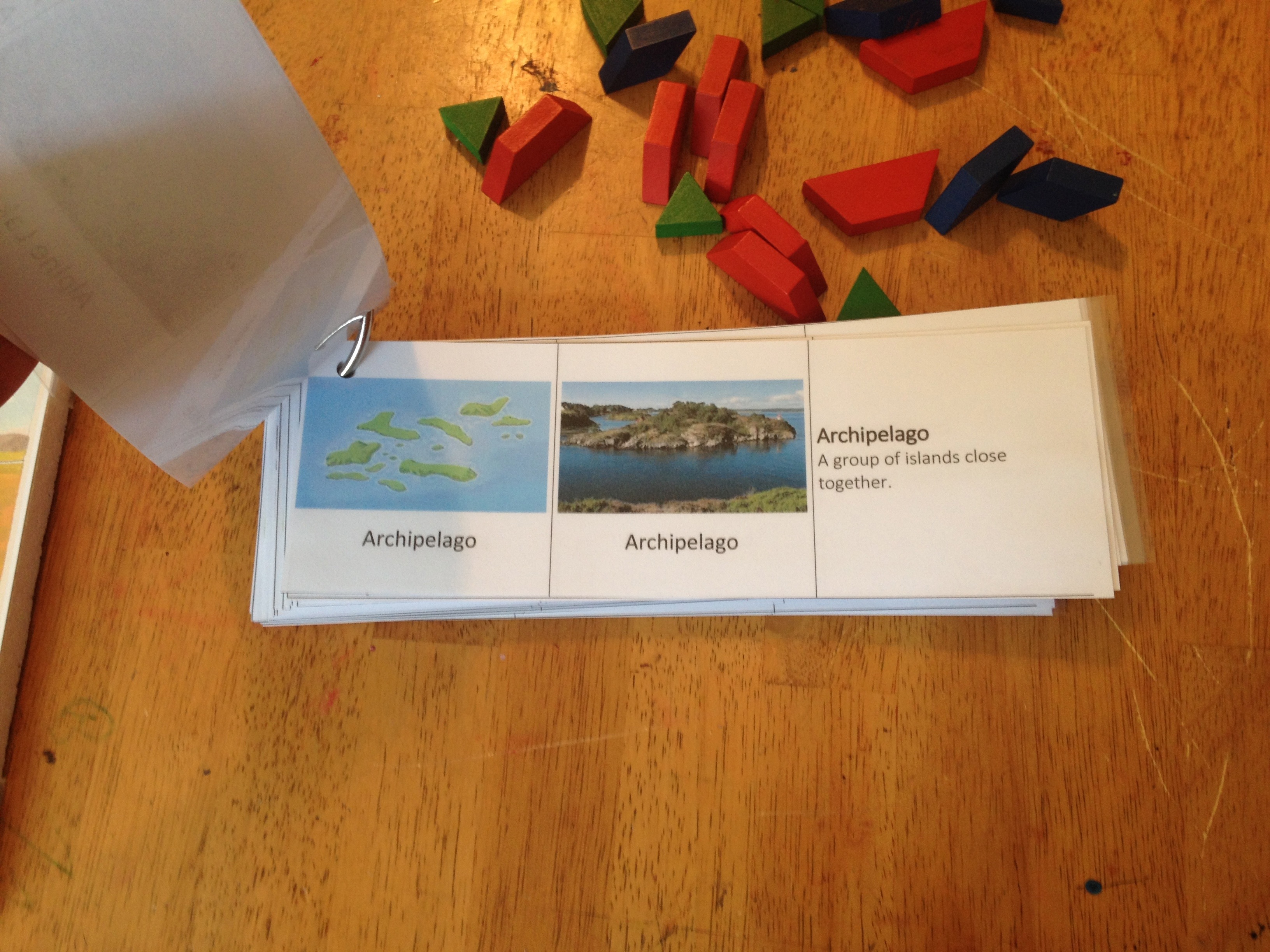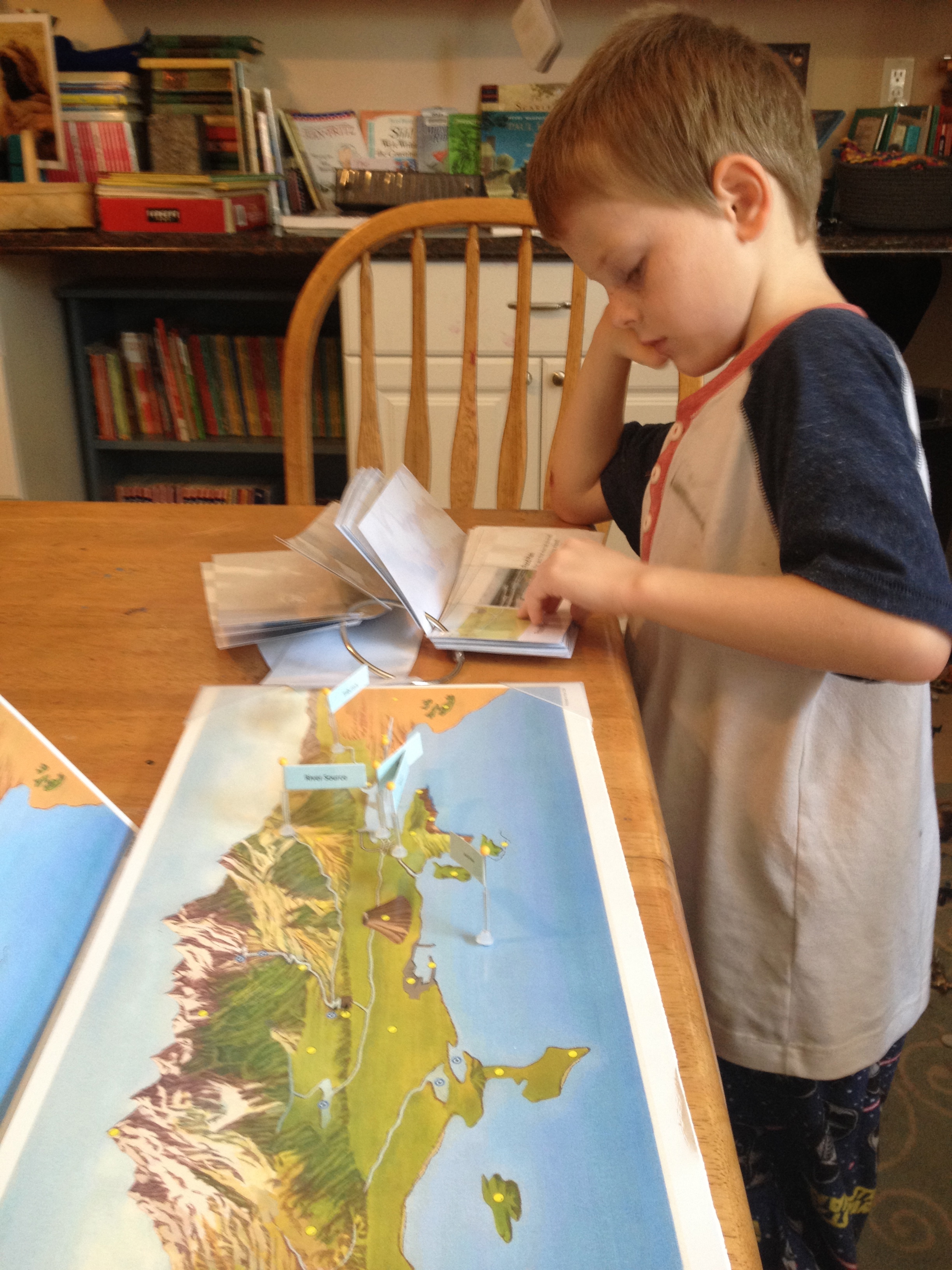 In the early afternoons, the boys like to work on handwriting, enjoy independent reading hour, work on their handicrafts (currently its simple basket weaving or knitting) or choose a fun hands on activity. My eldest has been enjoying Pin it! Maps Land and Water forms map lately, which I love.