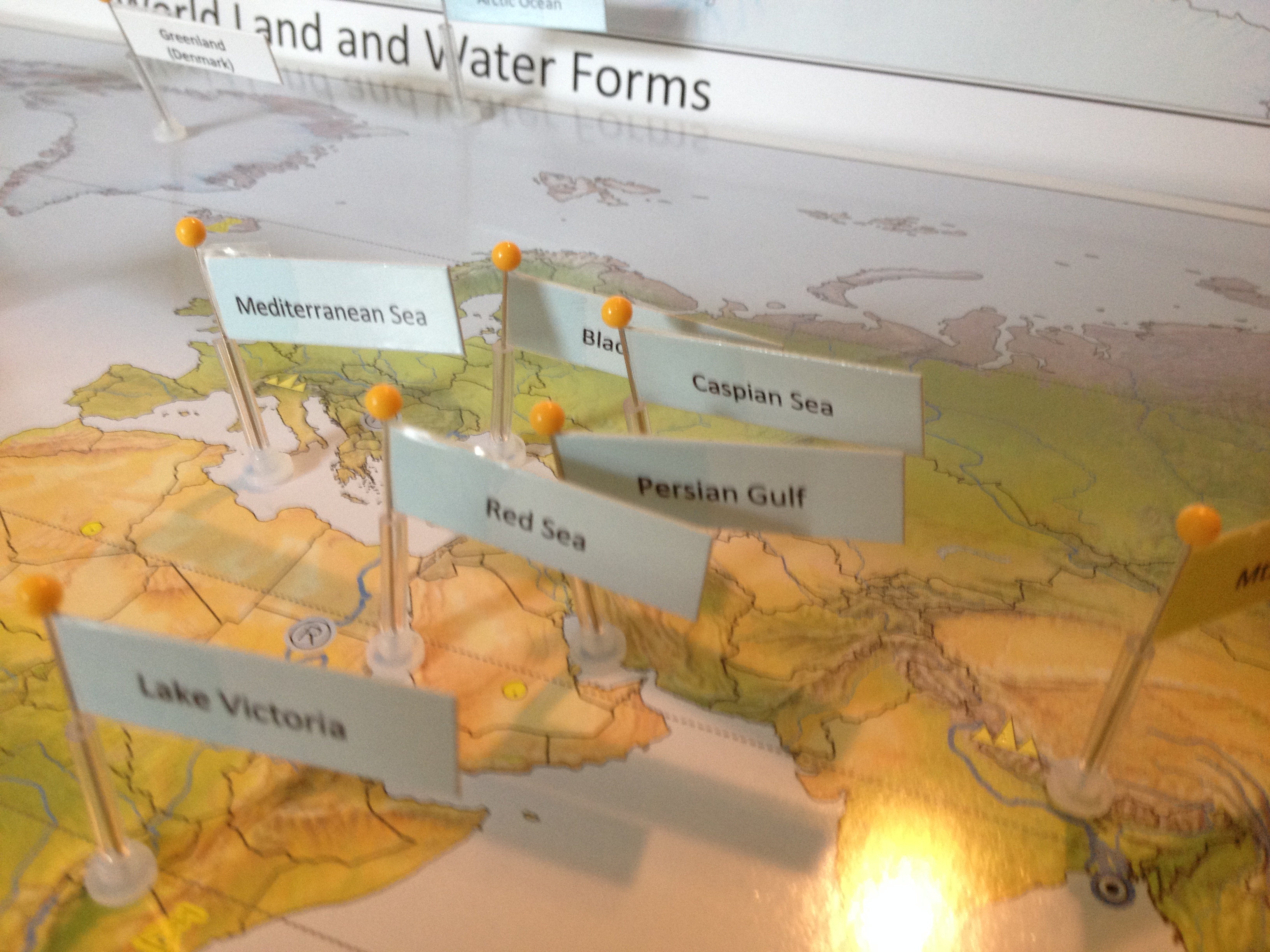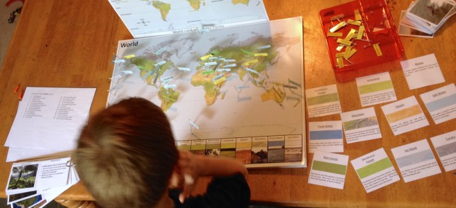My second born chose to work on the World Water and Landforms map during this time, which gives specific form names to pin in the proper place, (i.e. Nile River, Danube River, Mount Kilimanjaro, etc.) This is the next map we move onto after the generic Land and Water forms Map which names geographical features.