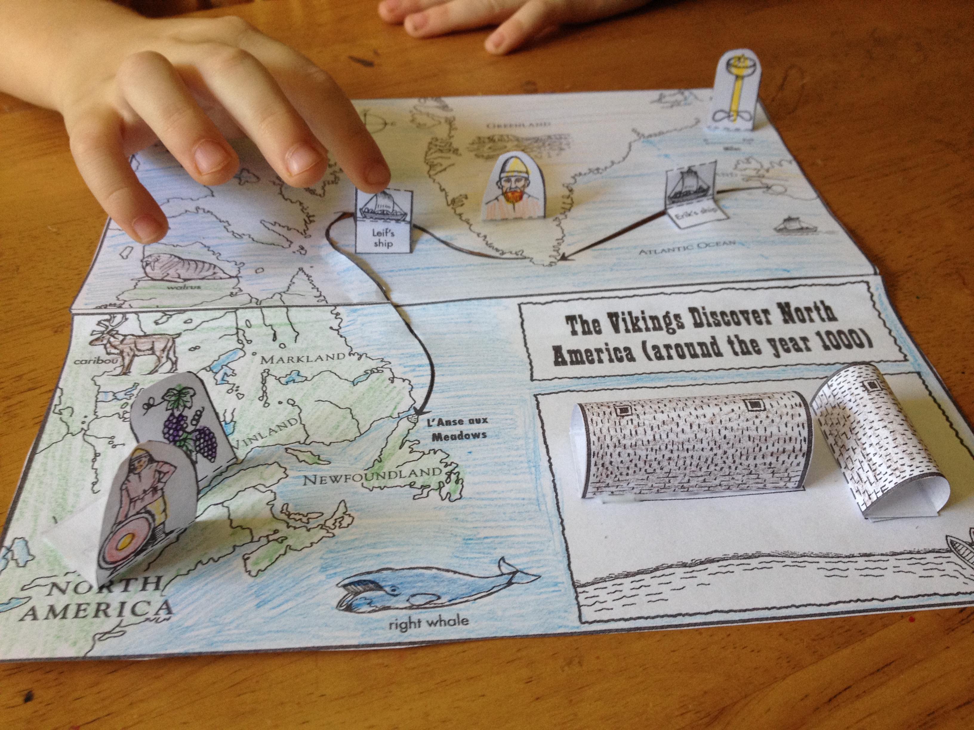 My boys are big on things they can touch and/or manipulate. I can read a story about the Viking voyage ten times and it won’t soak into their brains the way moving a boat through a chart will.