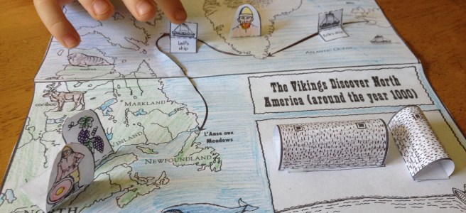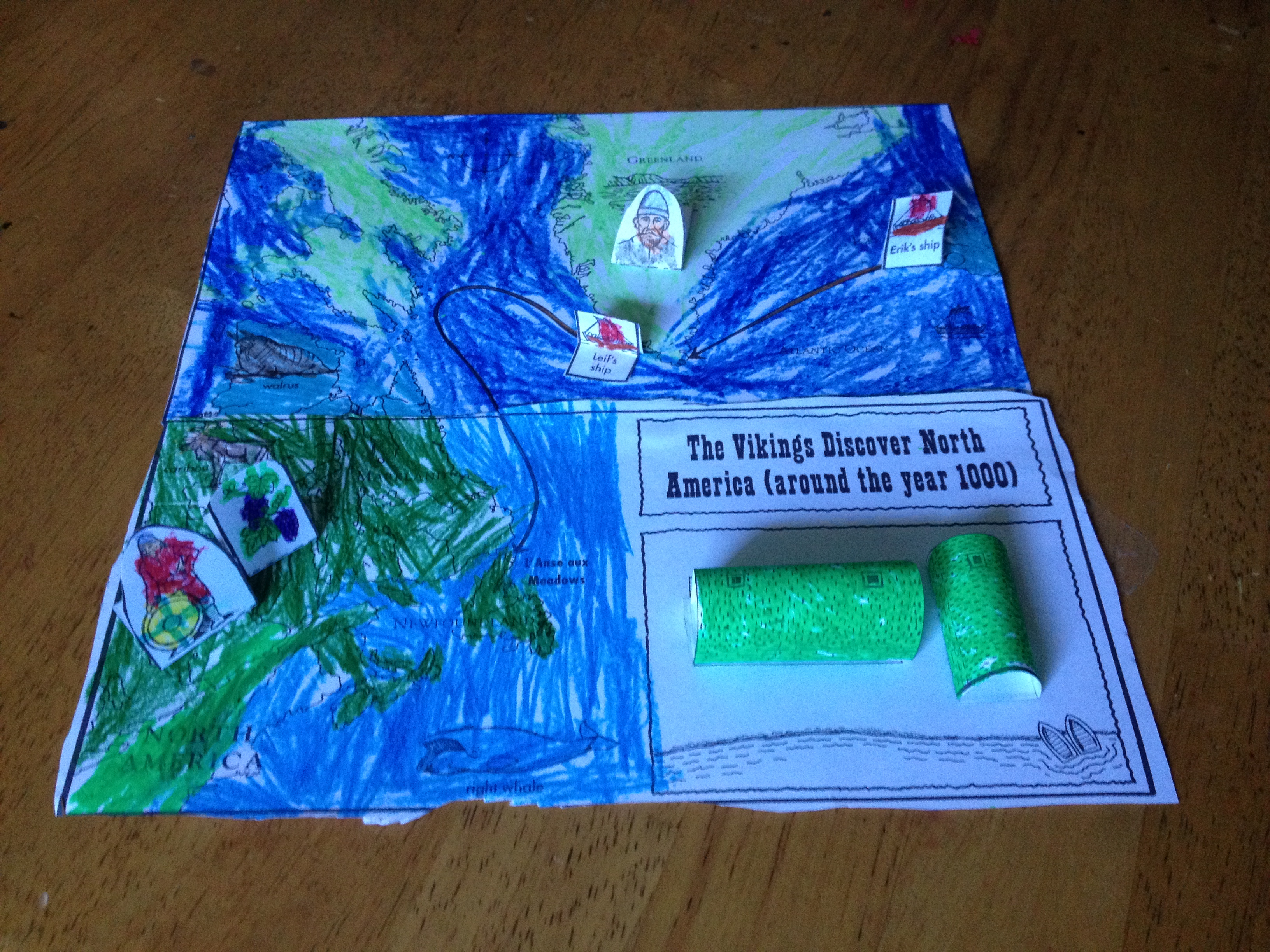 My eldest had no trouble coloring his own map and needed little assistance in assembling the pieces, specifically, he need help cutting the line into an open slit for the ships to travel in. Every time I read a Viking Tale or story last week, the boys would pull out these maps and play/follow along, moving Eric the Red’s ship from Iceland to Greenland while emanating accompanying growls and other boisterous Viking sounds.