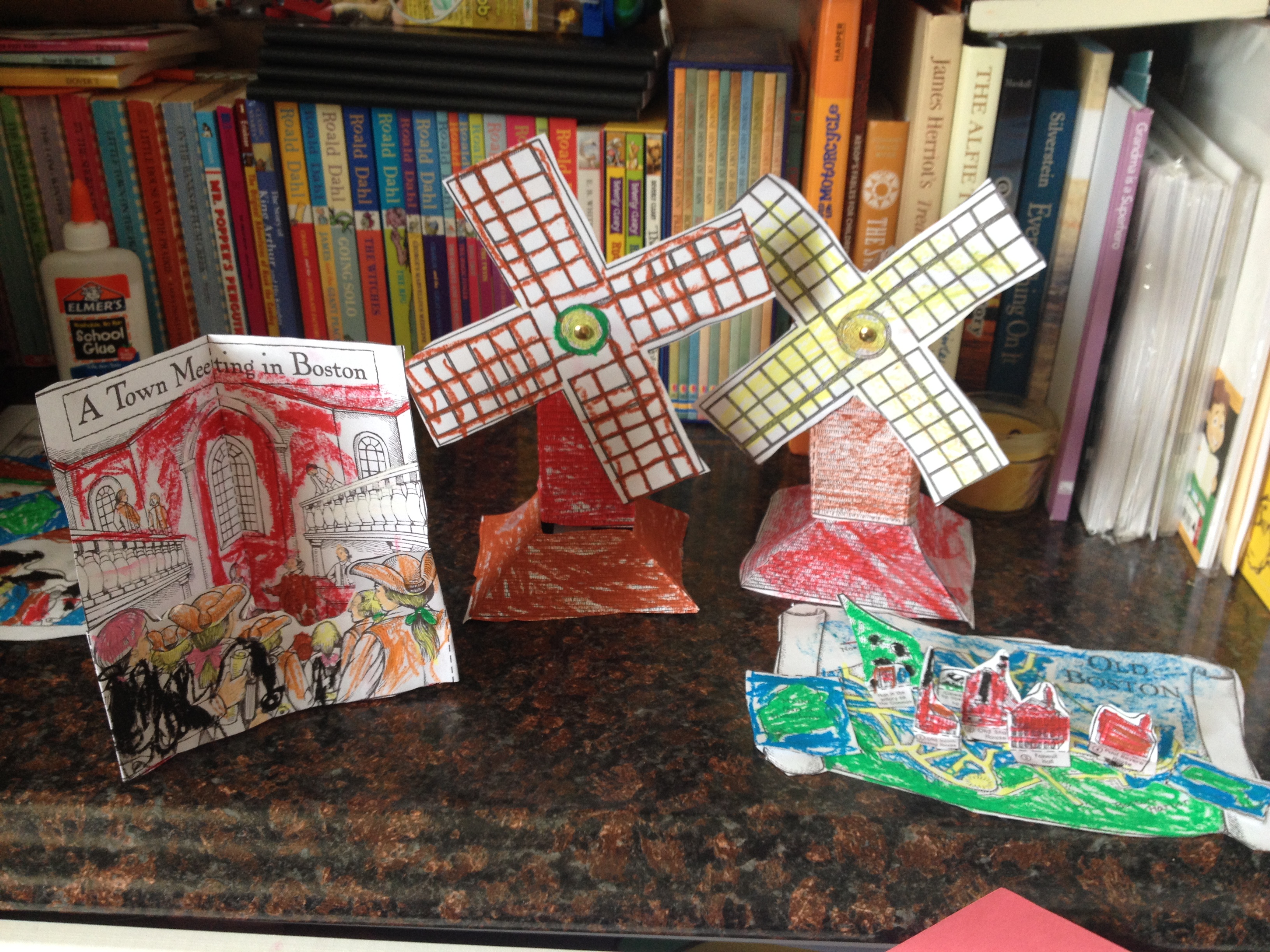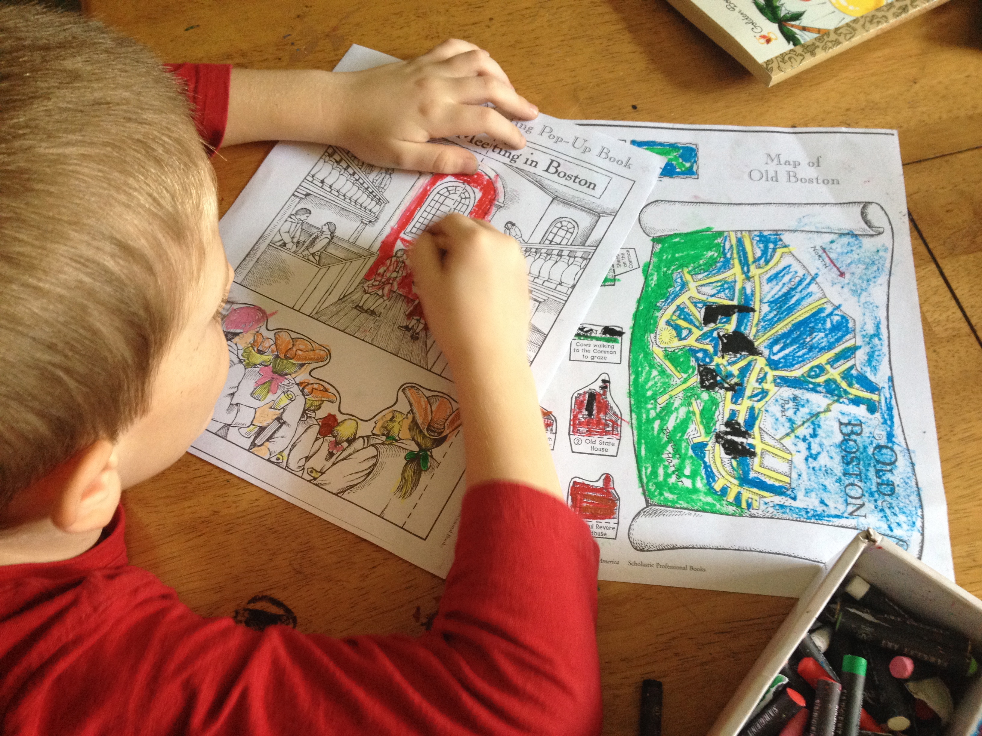 This week we used the book “Colonial America.” It provided the patterns for the projects listed earlier in this post. Dutch step homes, windmills, etc. This book was more challenging than the Pilgrims History Pockets book we used the week before. The boys had no trouble coloring in and cutting out all the pieces, but they were only able to independently assemble 2 out of the 8 projects we finished. I would not recommend this book if you are looking for independent work, unless your child is especially deft at constructing these sorts of models.
