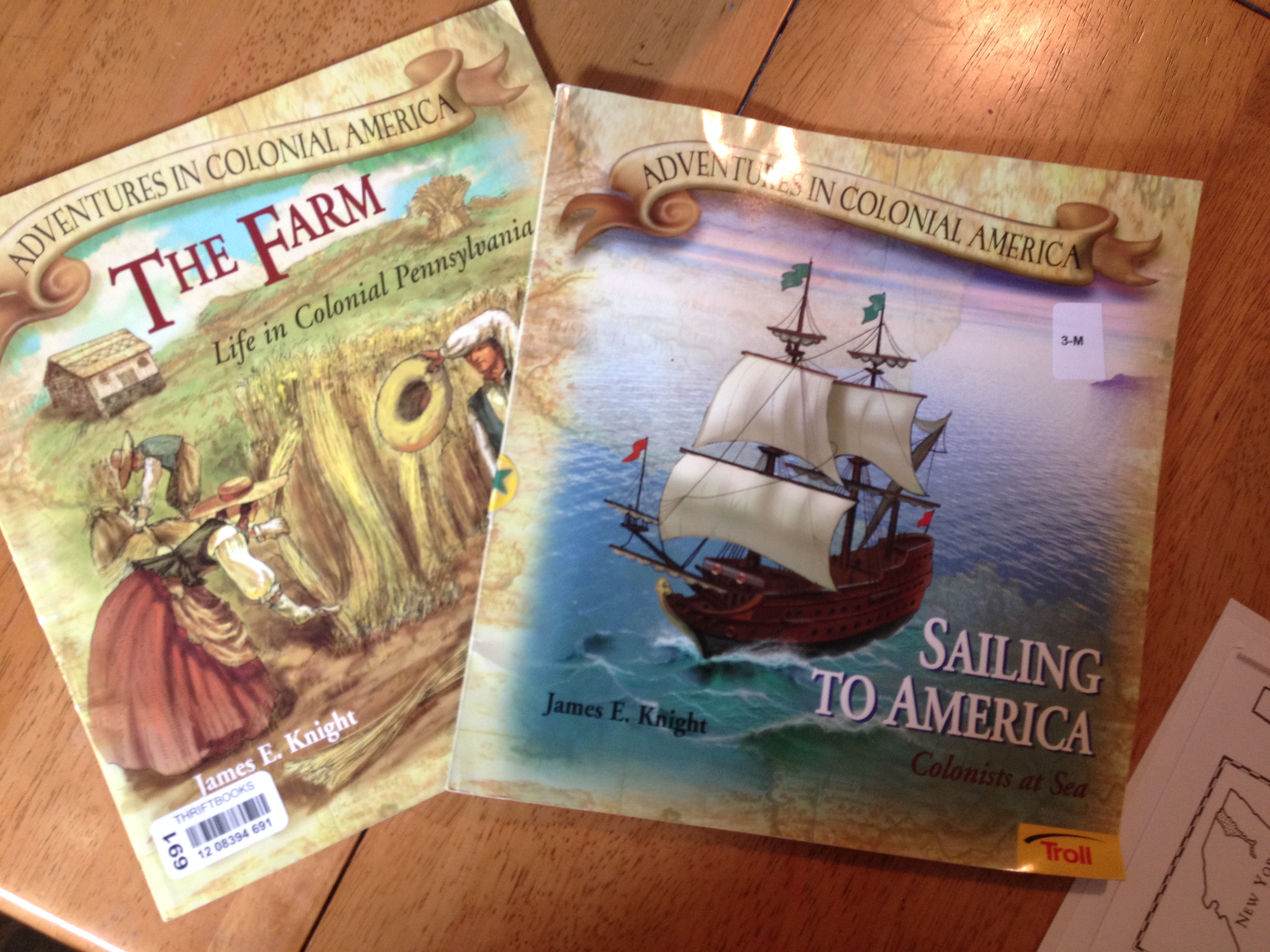 We completed our Beautiful Feet study of “The Courage of Sarah Noble,” well ahead of the MFW schedule, which allows us to read “The Matchlock Gun” next week, during Michigan Pioneers. We snuck in “Sign of the Beaver” during our noon reading. “Sign of the Beaver” carries many parallels to “The Courage of Sarah Noble,” but replaces a young heroine with a young hero. The boys were thrilled at the thought of being abandoned in the wilderness with only Indian neighbors for company. They are currently wondering which part of the farm they can run away to and how long they might survive there. Many votes have been cast in favor of “somewhere near the chicken coop so we can eat eggs!” We also managed to squeak in a few chapters of “Misty of Chincoteague.” I had not planned to read this book at all for our Adventures year, but our language arts book, Writing With Ease, used it this week and the boy’s collective curiosity was piqued. After all, “American Pioneers and Patriots” featured animals brought over on ships to New Amsterdam. What other voyages did European animals take to come to the New World? My eldest is considering penning a small children’s book for his baby brother about just such a journey. Whether or not he ever does it, I am pleased that he is thinking about storytelling.