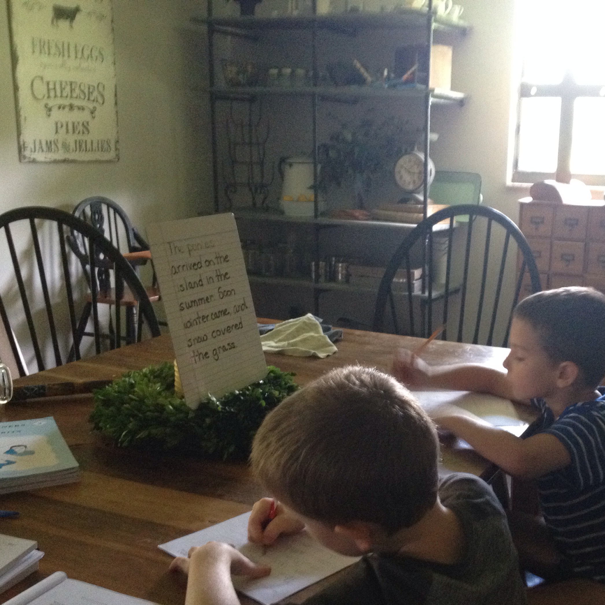 So we went on a very long sea voyage while summer rain pounded down on the roof of the farmhouse. Whenever lightning flashed we’d roll about on the bunk beds and pretend to be seasick while someone shouted out “Day 42!” or “Day 127!” The boys excel at feigning sea sickness, so I can check that off the list, “Things the Boys should learn in 2nd Grade.” We sometimes read aloud from our book basket to pass the time during the voyage. Then the six year old began to direct things, “We’ll eat this moldy worm bread and Mom, you can be Trinka the cow. Go hide in the closet with the other cows and let out a sad, seasick, ‘Mooooo’ every once in a while.” (I have grown so much as an actress this year between my turns as Goodwife Misery and Trinka the cow). The six year old became a little overbearing and at one point my four year old rolled his eyes and said, “Ugh! You are such a Duke of York!” Guess the preschool gang has been absorbing more than I thought they would…
